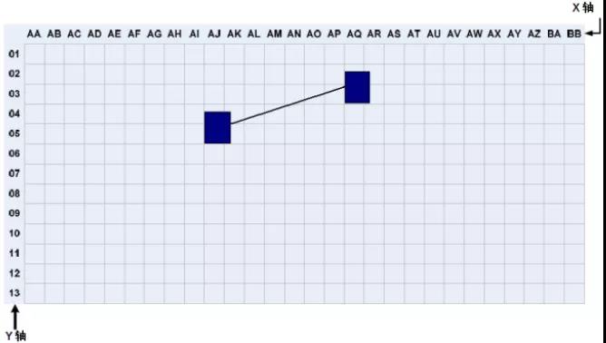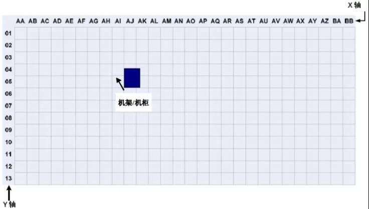 在數(shù)據(jù)中心,機柜和機架的位置和布局可以根據(jù)活動地板的劃分進行組織和標記。根據(jù)ANSI/TIA/EIA-606-A標準,數(shù)據(jù)室應使用兩個或兩個字母,每個600mm*600mm活動地板用阿拉伯數(shù)字標識。在數(shù)據(jù)中心機房平面圖上建立X、Y坐標系的網(wǎng)格,用字母標記X軸,用數(shù)字標記Y軸,建立坐標原點。機架和機柜的位置基于它們在網(wǎng)格地圖上的正面坐標。標注如下圖 2所示